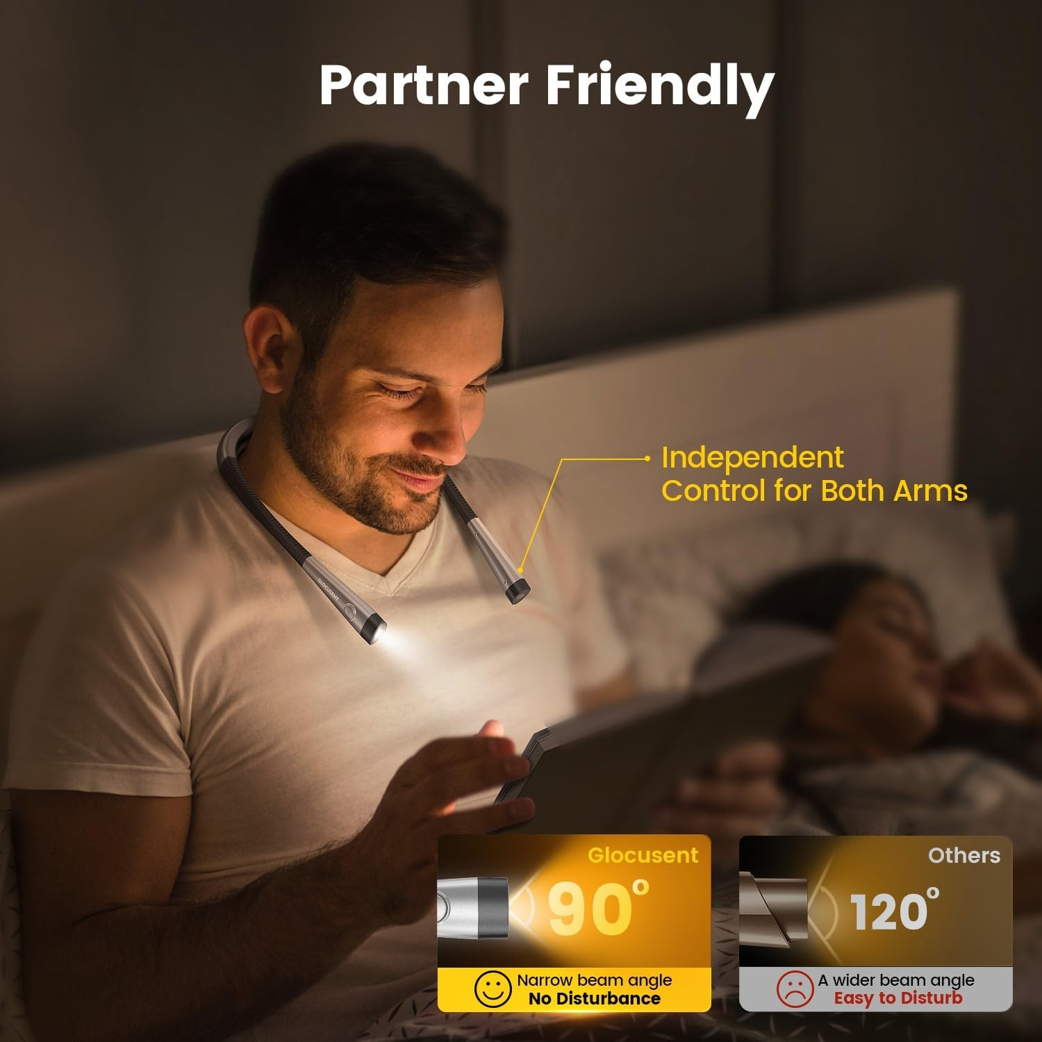 - [Partner Friendly & Versatile] Unlike other book lights for reading at night in bed, the Glocusent neck book light has a special narrow beam angle (90°) design. It is bright enough to illuminate the area you focus on while being dim enough not to disturb your sleeping partner. Additionally, the hands-free feature allows you to engage in various delicate activities such as knitting, walking, repairing, and more. Make it a perfect versatile book light